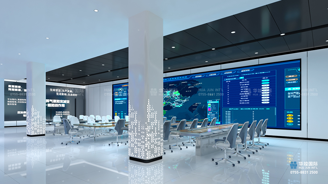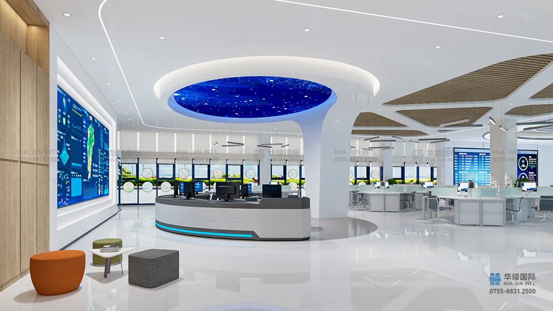 以現(xiàn)代簡(jiǎn)約的空間構(gòu)建手法,以氣象和數(shù)據(jù)為空間元素,打造簡(jiǎn)約大氣,重點(diǎn)突出的前廳接待空間。頂部天花用氣象的 LOGO勾勒出整體天花的設(shè)計(jì)感,墻面發(fā)光的數(shù)據(jù)表達(dá)大數(shù)據(jù)的元素,同步中間光效層層包裹中嵌入一塊LED大屏,播放江西智氣象空間全面的視頻介紹片。有時(shí)候也可以作為歡迎屏,切換歡迎詞來(lái)使用。