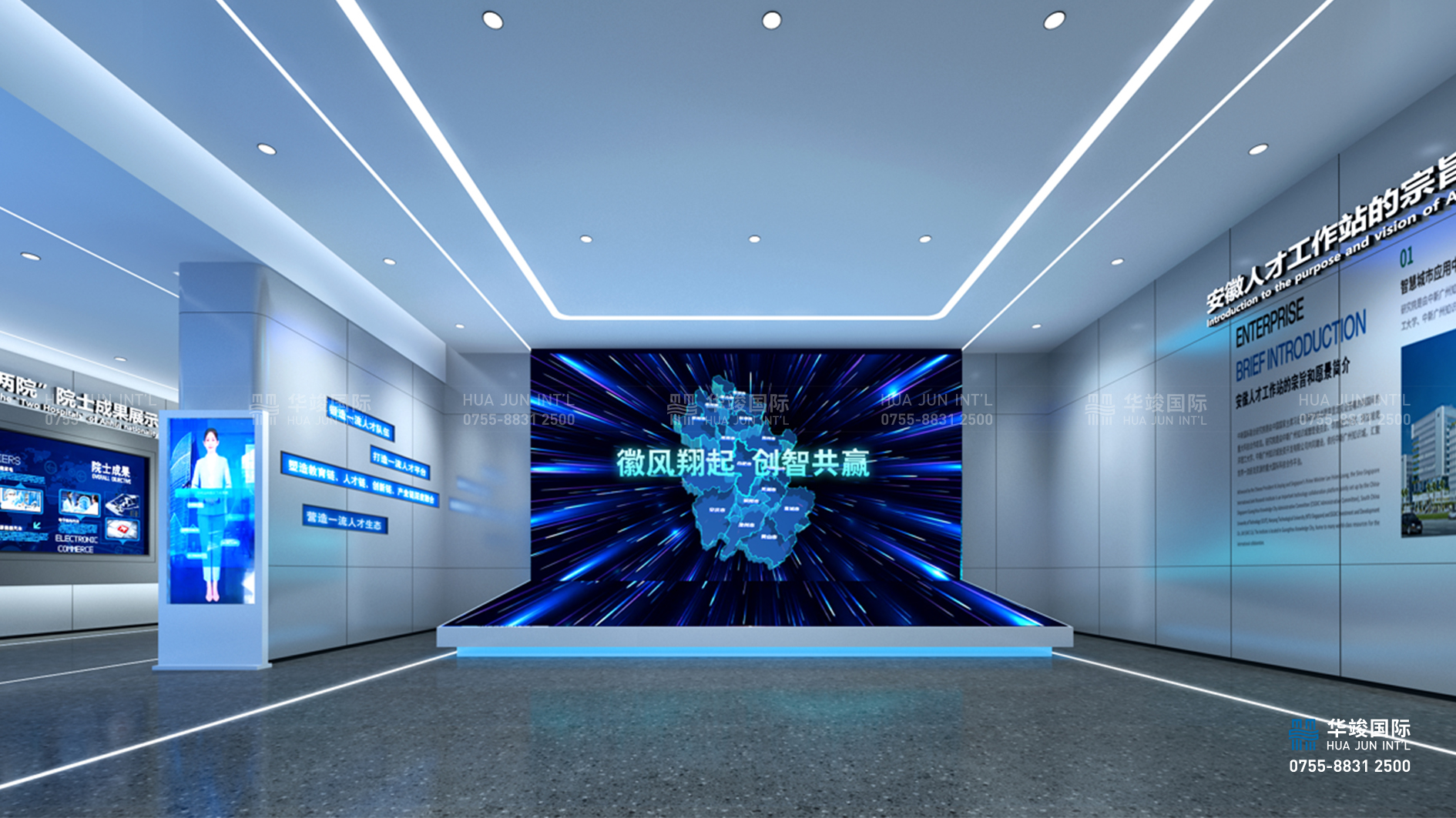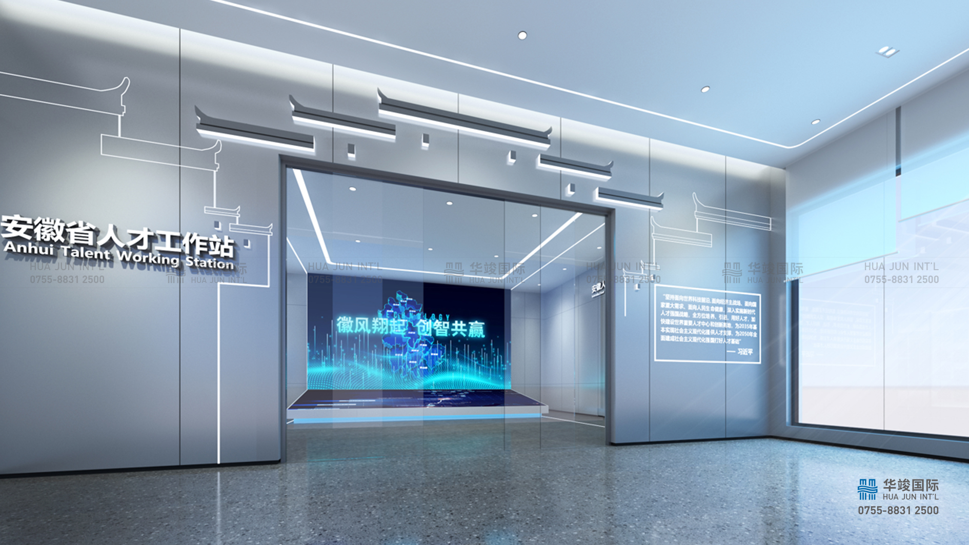 北京安徽大廈人才展廳設計由華竣執(zhí)行整體設計施工。華竣是專業(yè)的展館設計布展一體化服務商,融合多元國際前沿的設計理念和高新數字互動科技,打造獨具一格的展示館,注重空間主體化、內容故事化、展項場景化,更注重其承載的文化的展現(xiàn)。